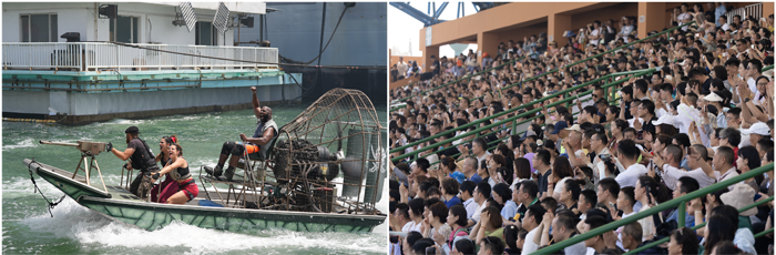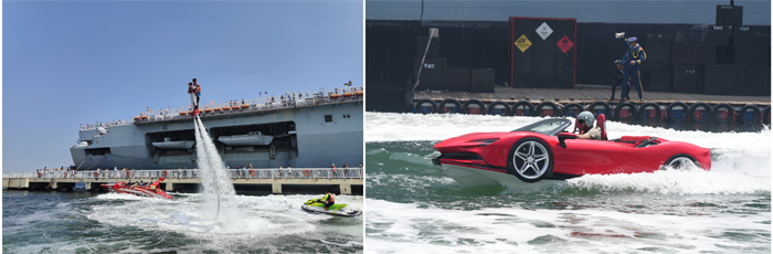 随着暑期来临,泰达航母引入时下流行的水上飞人、水上超跑等水上项目,在专业驾驶员的带领下,让游客亲身体验《航母风暴》特技演员们驰骋海上的刺激与快感,吸引了众多年轻爱好者的关注和喜爱。