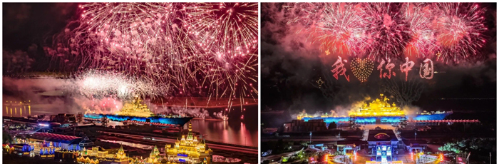 黄金周期间,泰达航母延续暑期夜场“焰遇航母”焰火音乐节热度,以“津彩盛焰·礼赞祖国”为主题,倾情推出“津彩盛焰国庆特别版”大型无人机焰火秀,为游客带来“白+黑”旅游新体验。焰火秀现场,数万发定制礼炮、数万枚焰火围绕“基辅号”航母联动绽放,引发现场游客阵阵惊叹。近千架无人机组成国庆主题图案惊喜亮相,万人高呼“祖国万岁”“我爱你中国”,高唱《我和我的祖国》,共祝祖国74周年华诞,节庆氛围浓厚。焰火秀结束后纷纷自发鼓掌欢呼,为演出、更为祖国点赞喝彩。节日期间,航母大型焰火秀活动获新华社、央视客户端、网易新闻、天津市电视台、津云、津滨海、天津日报、今晚报等多家主流媒体争相高频报道,更是霸屏抖音、小红书等自媒体平台。