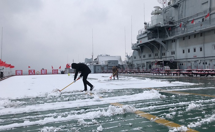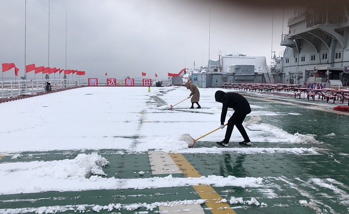 2020年2月2日,天津普降小雪。虽然泰达航母仍在疫情防控闭园期间,但景区严格按照《公司新型冠状病毒疫情防控工作方案》的部署要求坚持24小时带班值班制,公司主要负责人亲自挂帅,领导班子成员集体带领值班值守人员投入园区清雪扫雪任务中,为坚决落实疫情防控工作、维护景区清洁卫生的环境打下坚实基础。